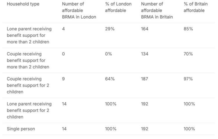 Policy in Practice carried out an analysis to assess the affordability of each BRMA across Britain, within the current benefit cap limits. Within this analysis, a BRMA was deemed affordable if: