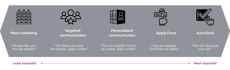 - Targeted communication: Proactively identifies and directly informs customers of their eligibility to support via personalised outreach that significantly improves take up