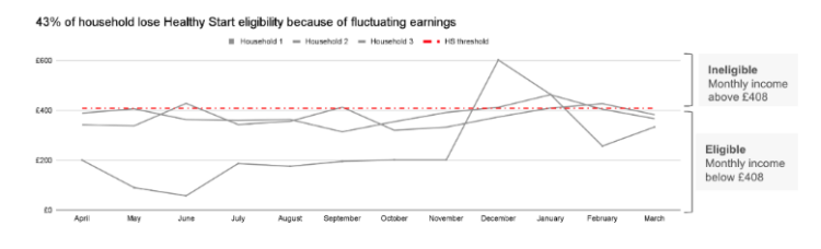 - Fluctuating earnings can mean fluctuating entitlements to passported benefits, such as Healthy Start and free NHS prescriptions. Free School Meal (FSM) entitlement is also impacted by fluctuating earnings, but entitlement is not lost because currently earnings are assessed over a number of assessment periods, and eligibility continues until the end of the child’s current phase of education