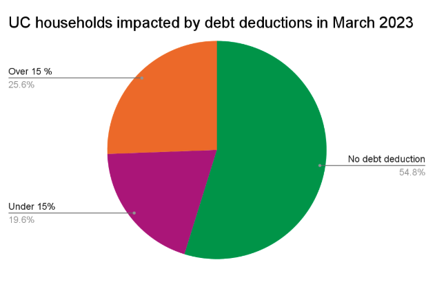 This chart shows the percentage of households impacted by different levels of debt deductions while on Universal Credit. One in four households lose 15% or more of their standard allowance due to debt reductions