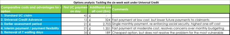 The range of options in the briefing note show that the six-week wait is not a necessary part of Universal Credit. Each option takes into account the policy intent of Universal Credit, to minimise barriers to work and promote independence, alongside the current policy issue of making payments quickly while considering the costs and administrative changes required.
