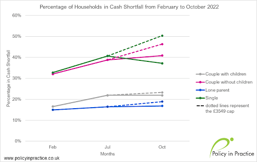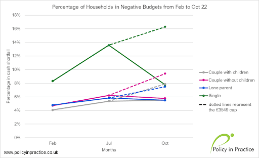 The combined impact of the Energy Price Guarantee and the cost of living payments bring the proportion of single households in negative budgets back to rates seen in February, when CPI inflation was 6.2% and the energy price cap was £1,277. This is positive as single households are likely to have a reduced capability to meet rising costs due to their smaller household size.