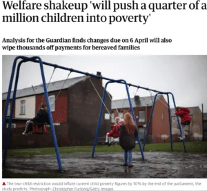 In addition, 70% of the 2 million low-income families at risk of the 2-child limit, if they have another child, are currently working. The policy doesn’t only affect those on benefits, because social security is a form of insurance, under this policy, larger families are no longer ‘covered’.